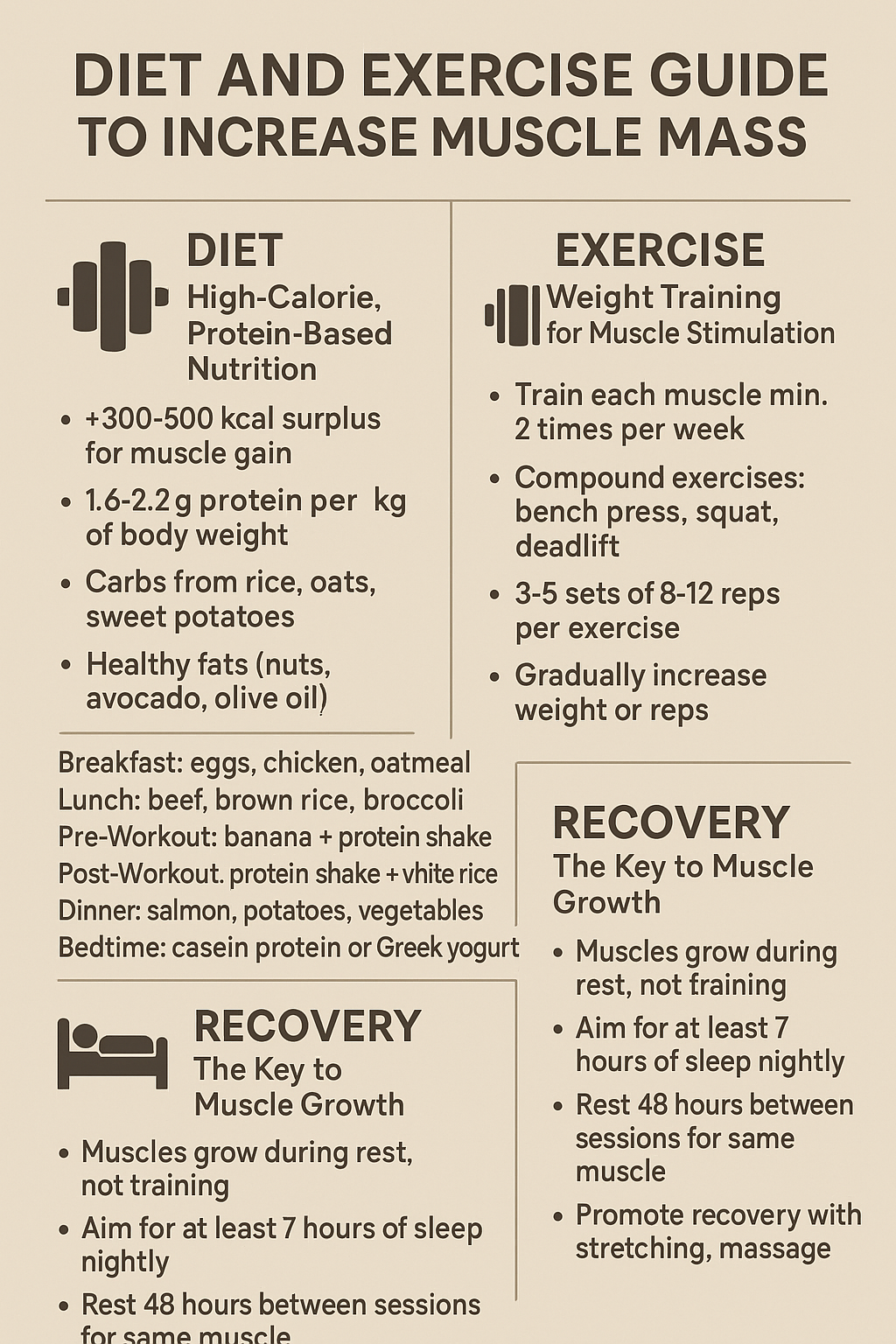 근육량을 증가시키기 위해서는 단순히 무거운 중량을 드는 것 이상의 체계적인 전략이 필요합니다. 이 글에서는 근육을 효과적으로 키우기 위한 핵심 요소인 식단과 운동에 대해 과학적이고 실용적인 접근을 제공합니다. 먼저, 단백질 중심의 고단백 고칼로리 식단 설계법과 체중 대비 단백질 섭취량 계산, 하루 섭취 열량 조절 방법, 운동 전후 보충식 섭취 타이밍 등 영양학적 기초를 상세히 다룹니다. 이어서 초보자와 중급자 모두에게 적합한 웨이트 트레이닝 구성 방식, 근육 부위별 대표 운동, 세트와 반복 수 설정, 점진적 과부하 원칙까지 포함한 효과적인 운동 루틴을 안내합니다. 또한, 근육이 실제로 성장하는 시기인 ‘회복기’의 중요성을 강조하며, 수면, 스트레칭, 휴식일의 배치, 폼롤링과 마사지와 같은 회복 전략도 소개합니다. 근육 성장의 3대 요소인 훈련, 영양, 회복을 균형 있게 통합함으로써, 초보자부터 목표가 명확한 피트니스 애호가까지 누구나 실천 가능한 실전 가이드를 제공합니다. 일관된 식습관과 훈련이 만들어내는 변화의 힘을 통해, 근육을 단순한 외형이 아닌 건강과 자신감의 상징으로 키우고자 하는 모든 이들에게 이 글은 유용한 지침이 될 것입니다.