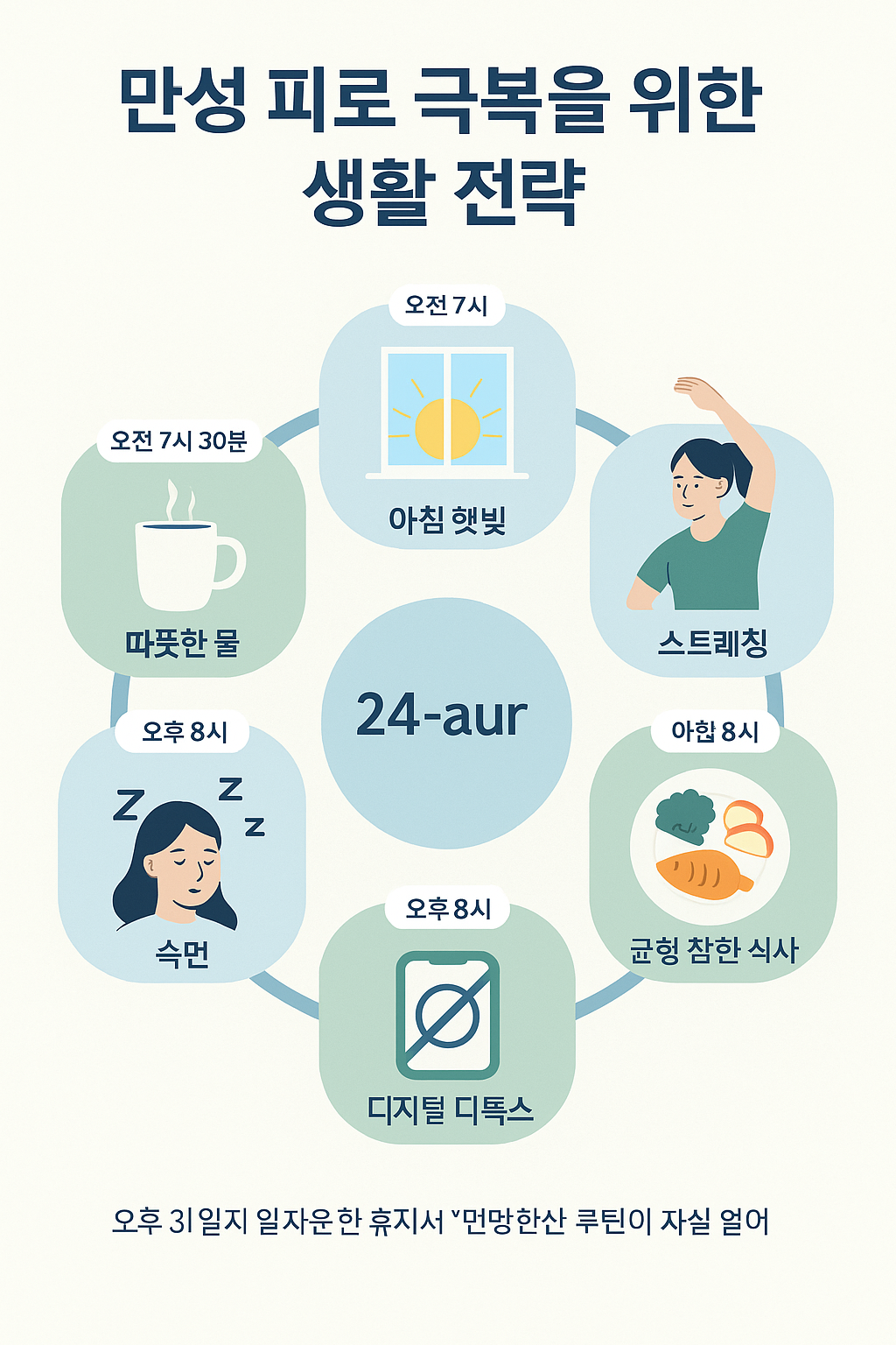 만성 피로는 어느 날 갑자기 찾아오는 질환이 아닙니다. 그것은 수년간 쌓인 무리한 생활 습관과 스트레스, 잘못된 식사와 수면, 불균형한 에너지 사용의 결과입니다. 그렇기 때문에 치료보다 **예방과 루틴 개선이 가장 근본적인 대안**이 될 수 있습니다. 우리는 피곤할 때 '더 쉬어야 한다'고 생각하지만, 실은 '제대로 된 루틴 안에서 쉬고 회복해야' 진짜 피로가 해소됩니다. 아침 햇살로 리듬을 재조정하고, 스트레칭으로 근육을 깨우며, 좋은 영양으로 체력을 채우고, 짧은 낮잠과 심리적 여유로 뇌를 회복시켜야 진정한 에너지 순환이 이루어집니다. 특히 현대인은 정보 과부하, 경쟁 사회, 디지털 중독에 익숙해져 있어 더 쉽게 피로에 노출됩니다. 하지만 반대로 작은 루틴의 힘을 의식하고 실천할 수 있다면, 에너지 고갈의 악순환에서 벗어나 더욱 탄탄한 신체와 멘탈을 만들 수 있습니다. 오늘도 지친 당신에게 필요한 것은 '대단한 변화'가 아니라, 작지만 확실한 루틴 한 가지입니다. 그 루틴이 하루를 바꾸고, 몸을 바꾸고, 결국 삶 전체를 변화시킬 수 있습니다. 이제부터는 피로에 끌려가지 말고, 에너지로 하루를 주도해보세요.
