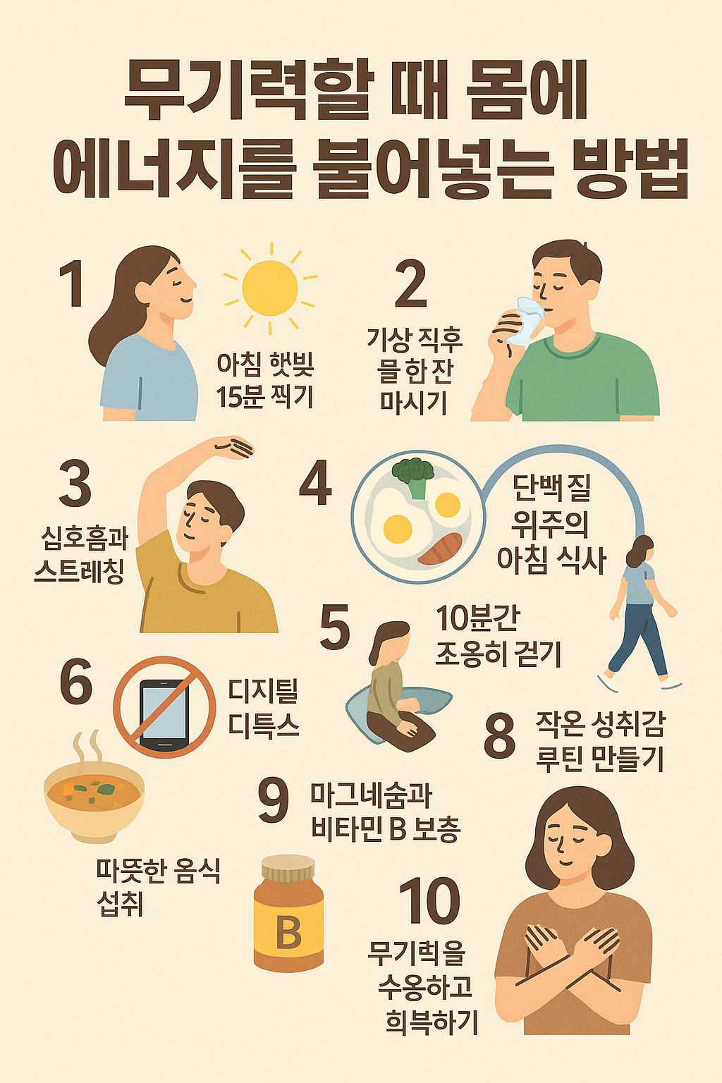 무기력함이란 단순히 피곤하거나 잠을 못 잤을 때 느껴지는 피로와는 다릅니다. 그것은 에너지 고갈의 신호이자, 신체와 마음이 동시에 멈춰 서는 감각입니다. 몸은 무겁고 머리는 멍한 상태가 지속되며, 어떤 일을 시작하려는 동기가 생기지 않고, 심지어 좋아하던 일조차 귀찮게 느껴질 때, 우리는 종종 그 상태를 ‘무기력’이라 부릅니다. 이러한 현상은 일시적인 피로가 아닌, 반복적이고 장기화된 생리적 불균형에서 비롯된 것일 수 있습니다. 현대 사회는 끊임없는 자극과 긴장 속에서 살고 있습니다. 바쁜 업무, 인간관계의 스트레스, 불규칙한 수면과 식사, 스마트폰과 디지털 기기에 과도하게 노출된 뇌는 쉬지 않고 과열 상태를 유지합니다. 이러한 환경 속에서 우리 몸은 계속해서 에너지를 소모하고 있지만, 회복할 기회를 얻지 못합니다. 결국 에너지 저장고는 바닥나고, 그 결과로 무기력감이 밀려오게 됩니다. 무기력은 단순한 나약함의 표현이 아닙니다. 오히려 우리 몸이 스스로를 보호하려고 보내는 중요한 신호입니다. 체내 호르몬 불균형, 자율신경계의 불안정, 신경전달물질의 감소, 미세염증 상태 등 생리학적으로 설명 가능한 변화들이 무기력의 배경에 존재합니다. 특히 아침에 일어났을 때 상쾌하지 않거나, 일을 시작하려는 생각만 해도 압박감을 느끼며, 아무리 쉬어도 피로가 해소되지 않는다면 이는 단순한 피곤이 아닌, 신체 에너지 시스템의 붕괴를 의미할 수 있습니다. 이럴 때일수록 중요한 것은 ‘의지’가 아니라 ‘방법’입니다. 억지로 참고 버티려 하기보다는, 어떻게 하면 자연스럽게 에너지를 되살릴 수 있을지에 대해 고민하고 실천하는 것이 회복의 열쇠입니다. 의지를 앞세우기보다는 몸이 자연스럽게 깨어나도록 돕는 작은 실천이 더 큰 효과를 가져옵니다. 심호흡, 스트레칭, 자연광 노출, 단백질 섭취, 충분한 수면, 영양 보충 등은 생각보다 빠르게 체내 에너지 회복을 유도할 수 있습니다. 이 글에서는 바로 그런 무기력한 순간에 몸과 마음의 리듬을 회복시키고 에너지를 불어넣는 과학적이고 실천 가능한 10가지 방법을 소개합니다. 모든 전략은 ‘작지만 꾸준한 실천’이라는 원칙 아래 정리되어 있으며, 당신의 일상에 자연스럽게 녹아들 수 있도록 구성되어 있습니다. 지금 무기력함을 느끼고 있다면, 그것은 결코 당신이 게으르거나 부족해서가 아닙니다. 오히려 당신이 그동안 최선을 다해왔기 때문에, 이제는 몸이 잠시 쉬고 회복을 필요로 한다는 신호일 뿐입니다. 이 글을 통해 다시 삶의 활력을 되찾고, 일상 속에서 천천히 자신의 리듬을 회복해보시기 바랍니다.