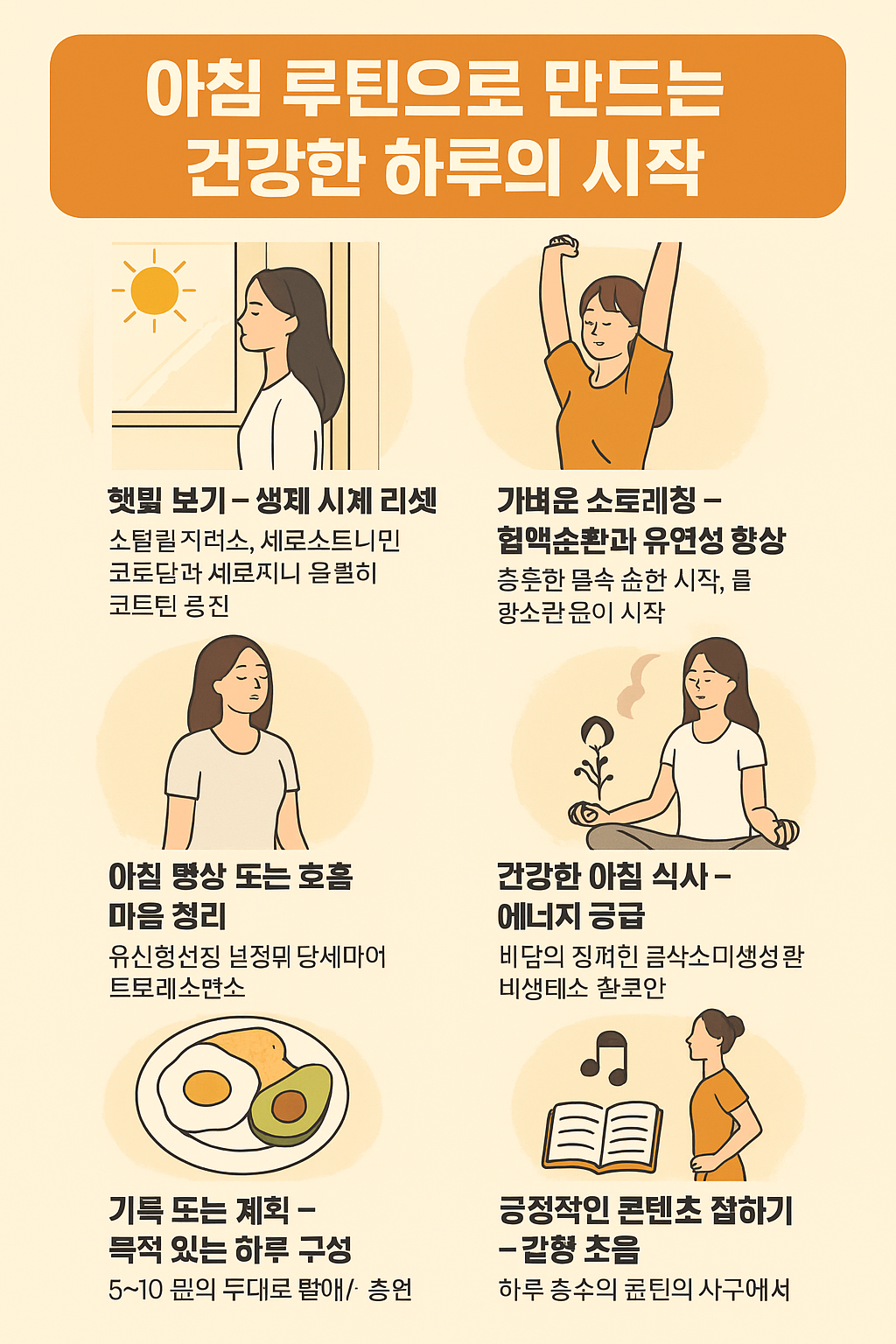 아침은 하루 중 가장 중요한 시간대 중 하나입니다. 밤새 휴식한 몸이 다시 활동을 시작하는 순간이자, 하루의 신체 리듬과 정신적 방향이 정해지는 출발점이기 때문입니다. 우리가 자는 동안 신체는 회복과 정비를 거치며 새로운 하루를 준비하고, 아침이 되면 그 회복된 에너지를 어떻게 사용할지를 스스로 결정하게 됩니다. 이때 어떤 루틴을 가지느냐에 따라 하루의 컨디션, 집중력, 감정 상태, 면역력, 심지어 식욕과 대사까지 달라질 수 있습니다. 현대인의 바쁜 삶 속에서는 아침을 무시하거나 서두르기 쉬운 환경이 조성되어 있습니다. 알람이 울리고, 눈을 비비며 급히 세수만 하고 나오는 아침. 설령 기상 시간은 확보했더라도 스마트폰을 먼저 확인하고, 커피 한 잔으로 식사를 대체하거나, 우울한 기분과 스트레스에 휩싸인 채 하루를 시작하는 경우가 많습니다. 이러한 습관들은 장기적으로 보면 체내 리듬을 교란시키고, 호르몬 분비 이상, 피로 누적, 우울감 증가, 집중력 저하 등 다양한 문제를 유발할 수 있습니다. 반대로 올바른 아침 루틴을 가지는 사람들은 뇌 기능이 더 활발하고, 신체 에너지를 효율적으로 활용하며, 스트레스 저항력도 강하다는 연구 결과들이 계속 보고되고 있습니다. 예를 들어, 일어나자마자 햇빛을 쬐는 것만으로도 멜라토닌 분해와 세로토닌 활성화를 도와 생체리듬을 리셋하고 기분을 상쾌하게 만들어주며, 물 한 잔을 마시는 것만으로도 혈액순환을 자극하고 장 기능을 개선할 수 있습니다. 이 글에서는 누구나 실천할 수 있는 아침 루틴 구성법을 소개합니다. 단순한 ‘할 일 목록’이 아니라, 왜 그 루틴이 중요한지, 어떤 효과가 있는지, 나에게 맞는 루틴은 무엇인지 등을 과학적 근거를 바탕으로 풀어내고자 합니다. 몸과 마음을 동시에 깨우는 루틴은 단순히 아침 시간에 국한되지 않고, 하루 전체의 퍼포먼스를 결정짓는 핵심 열쇠입니다. 당신의 하루는 아침에 시작되지 않습니다. 아침 루틴에서 시작됩니다.