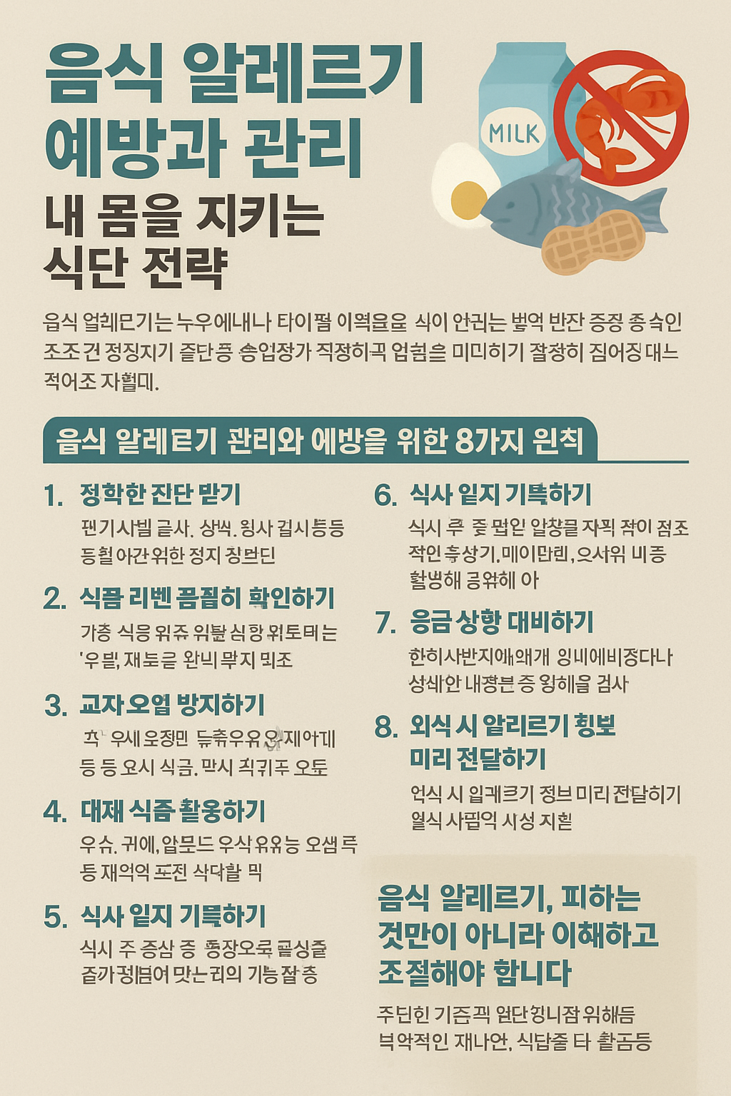음식 알레르기는 단순히 몇 가지 음식을 먹지 않는 것만으로는 해결되지 않습니다. 이는 우리 몸의 면역 체계가 어떻게 반응하느냐와 직결되는 복합적인 현상이기 때문에, **정확한 진단, 식품 선택, 생활 습관** 모두를 포함한 통합적인 관리가 필요합니다. 다행히도 음식 알레르기는 조기에 인지하고 관리할수록 삶의 질을 충분히 유지할 수 있습니다. 최근에는 식품 산업에서도 알레르기 대체 식품이 다양하게 개발되고 있고, 외식 환경도 알레르기 인식을 반영해 변화하고 있습니다. 중요한 것은, **스스로 자신의 몸을 정확히 알고 식탁 위에서 주도권을 잡는 것**입니다. 아이를 키우는 부모라면 특히 더 주의가 필요합니다. 알레르기 반응이 있는 아이에게 ‘그냥 먹어도 괜찮겠지’라는 안일한 태도는 위험하며, 학교나 어린이집에 정확한 정보를 전달하고 응급 상황에 대비한 준비도 갖춰야 합니다. 음식은 우리 삶의 기쁨이자 건강의 근원입니다. 알레르기가 있다는 이유로 그것이 두려움이 되거나 제한의 상징이 되어선 안 됩니다. 오히려 올바른 이해를 바탕으로 조절하고 대처해나간다면, 우리는 더욱 현명하게 건강을 지킬 수 있습니다. 알레르기를 안고 살아가는 것이 아니라, **알레르기를 이해하고 함께 살아가는 법을 배우는 것**, 그것이 진정한 건강관리의 시작입니다.