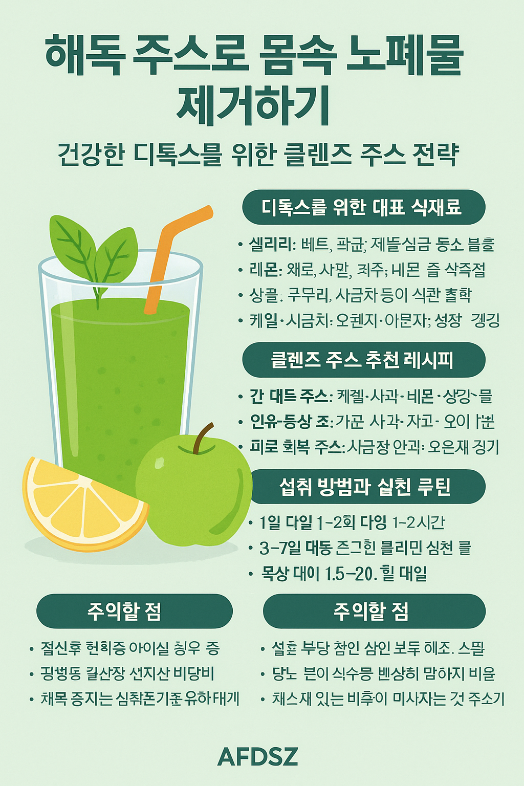 클렌즈 주스는 단순한 음료가 아닌, **현대인의 건강한 해독 루틴**입니다. 체내 노폐물과 독소를 효과적으로 배출하기 위해선 재료 선택부터 섭취 타이밍, 생활 습관까지 통합적으로 접근해야 합니다. 아래는 건강한 디톡스를 위한 실전 전략입니다.
