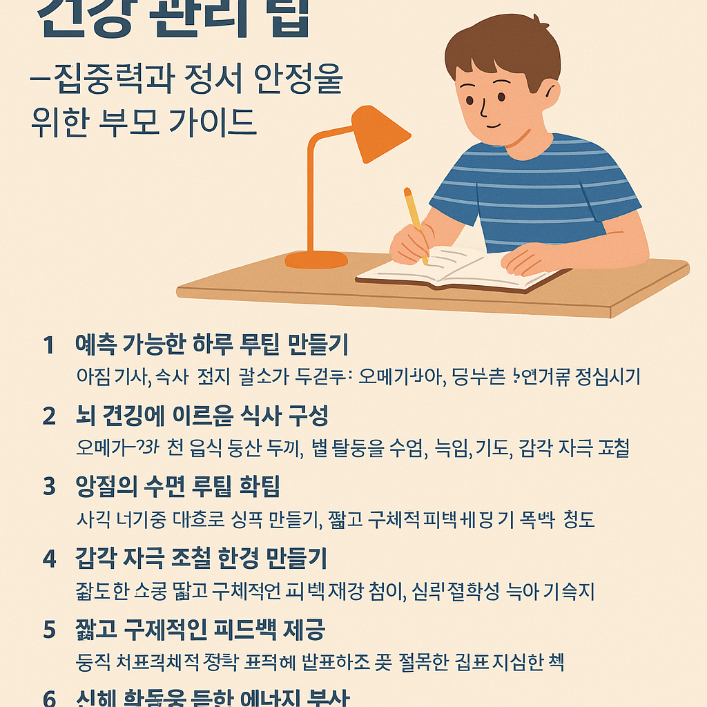 ADHD 아동은 단지 산만한 것이 아니라, 뇌의 발달 및 자극 반응 방식이 일반적인 아동과 다릅니다. 이로 인해 환경, 리듬, 감각 자극, 피드백 방식 등 모든 일상 요소가 아이의 집중력과 정서 안정에 직접적으로 영향을 미칩니다. 다음은 ADHD 아동이 보다 편안하고 건강하게 일상을 보낼 수 있도록 도와주는 구체적인 건강 관리 전략입니다.